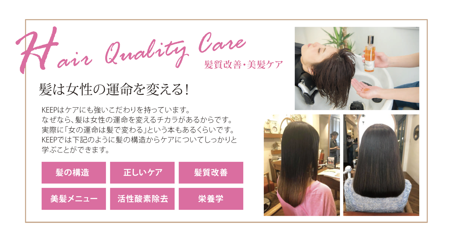KEEPは、パーマ×マッシュorボブが一目惚れレベルの完璧スタイル。 一見作り込まれたスタイルで、翌日以降自分で上手くできなく見えますが、 再現性にはしっかりこだわっているスタイルです。 髪質診断に基づいた髪の栄養重視のパーマ、カラーで、デザイン性スタイルが実現します。